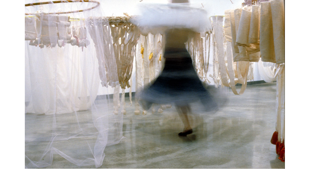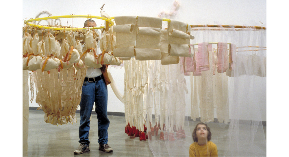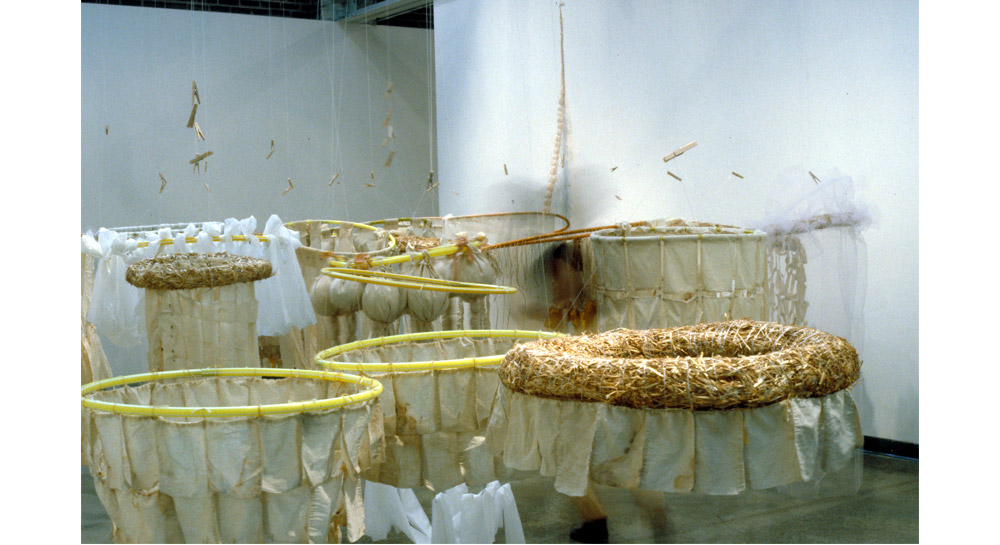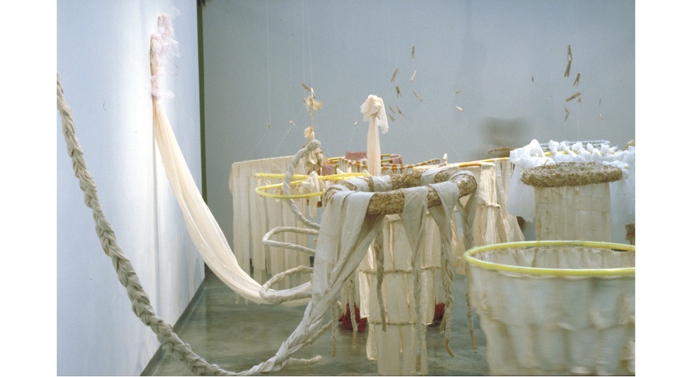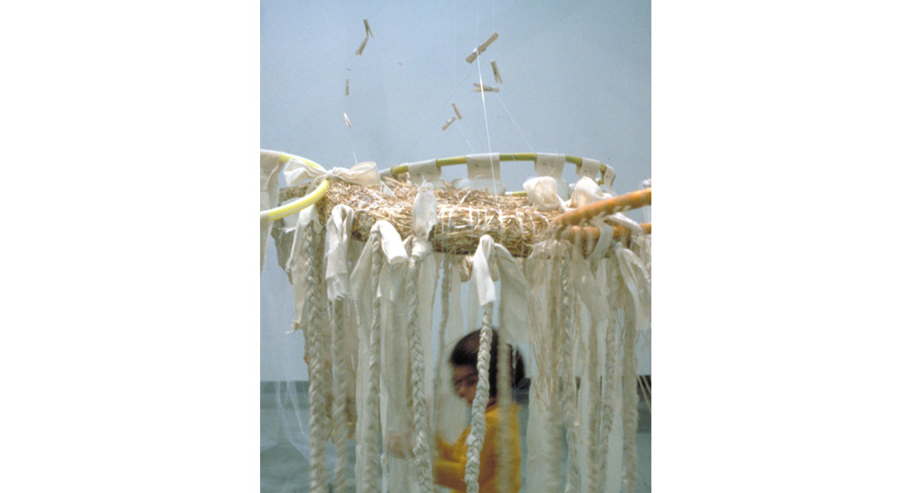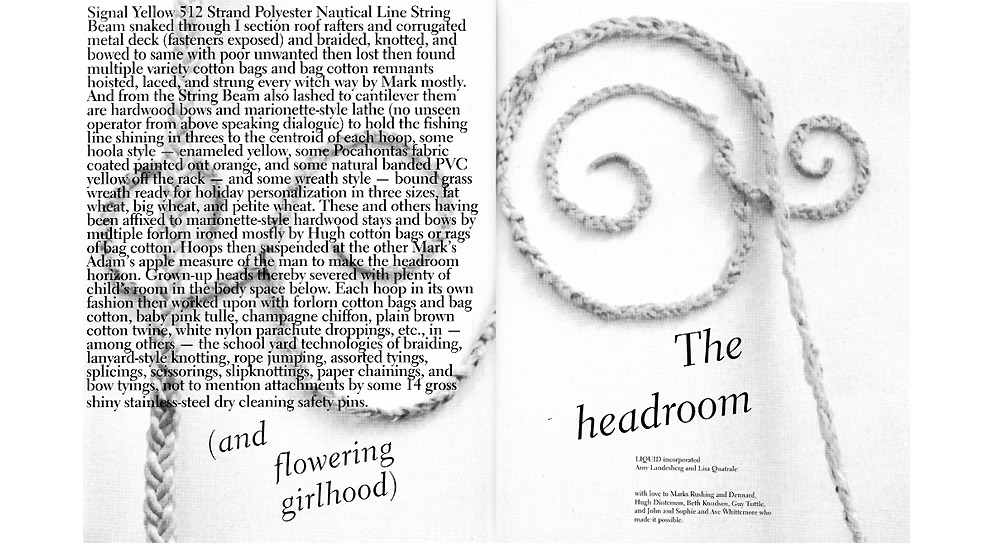 Signal Yellow 512 Strand Polyester Nautical Line String Beam snaked through I section roof rafters and corrugated metal deck (fasteners exposed) and braided, knotted, and bowed to same with poor unwanted then lost then found multiple variety cotton bags and bag cotton remnants hoisted, laced ,and strung every witch way by Mark mostly. And from the String Beam also lashed to cantilever them are hardwood, bows and marionette-style lathe (no unseen operator from ‘above speaking dialogue) to hold the fishing line shining in threes to the centroid of each hoop, some hoola style -enameled yellow, some Pocahontas fabric coated painted out orange, and some natural banded PVC yellow off the rack -and some wreath style – bound grass wreath ready for holiday personalization in three sizes: fat wheat, big wheat, and petite wheat. These and others having been affixed to marionette-style hardwood stays and bows by multiple forlorn ironed mostly by Hugh cotton bags or rags of bag cotton. Hoops then suspended at the other Mark’s Adam’s apple measure of the man to make the headroom horizon. Grownup heads thereby severed with plenty of Childs room in the body space below. Each hoop in its own fashion then worked upon with forlorn cotton bags and bag cotton, baby pink tulle, champagne chiffon, plain brown cotton twine, white nylon parachute droppings, etc., in – among others – the school yard technologies of braiding, lanyard-style knotting, rope jumping, assorted tyings, splicings, scissorings, slipknottings, paper chainings, and bow tyings not to mention attachments by some 14 gross shiny stainless-steel dry cleaning safety pins.