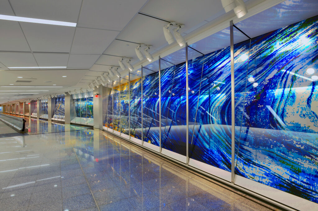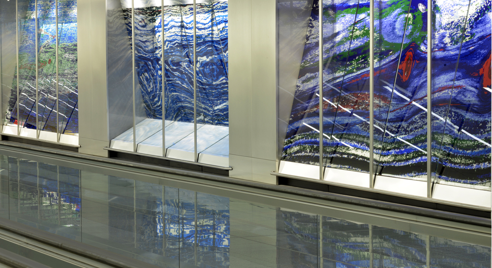 Veneers is a 640 linear foot art wall consisting of 127 Unique Modular Art Units containing 508 pieces of glass. All glass connections are made using chemical bonds, with no mechanical fasteners visible throughout the installation. In place of a typical storefront glass infill, this unitized approach allows for almost seamless bays of image.