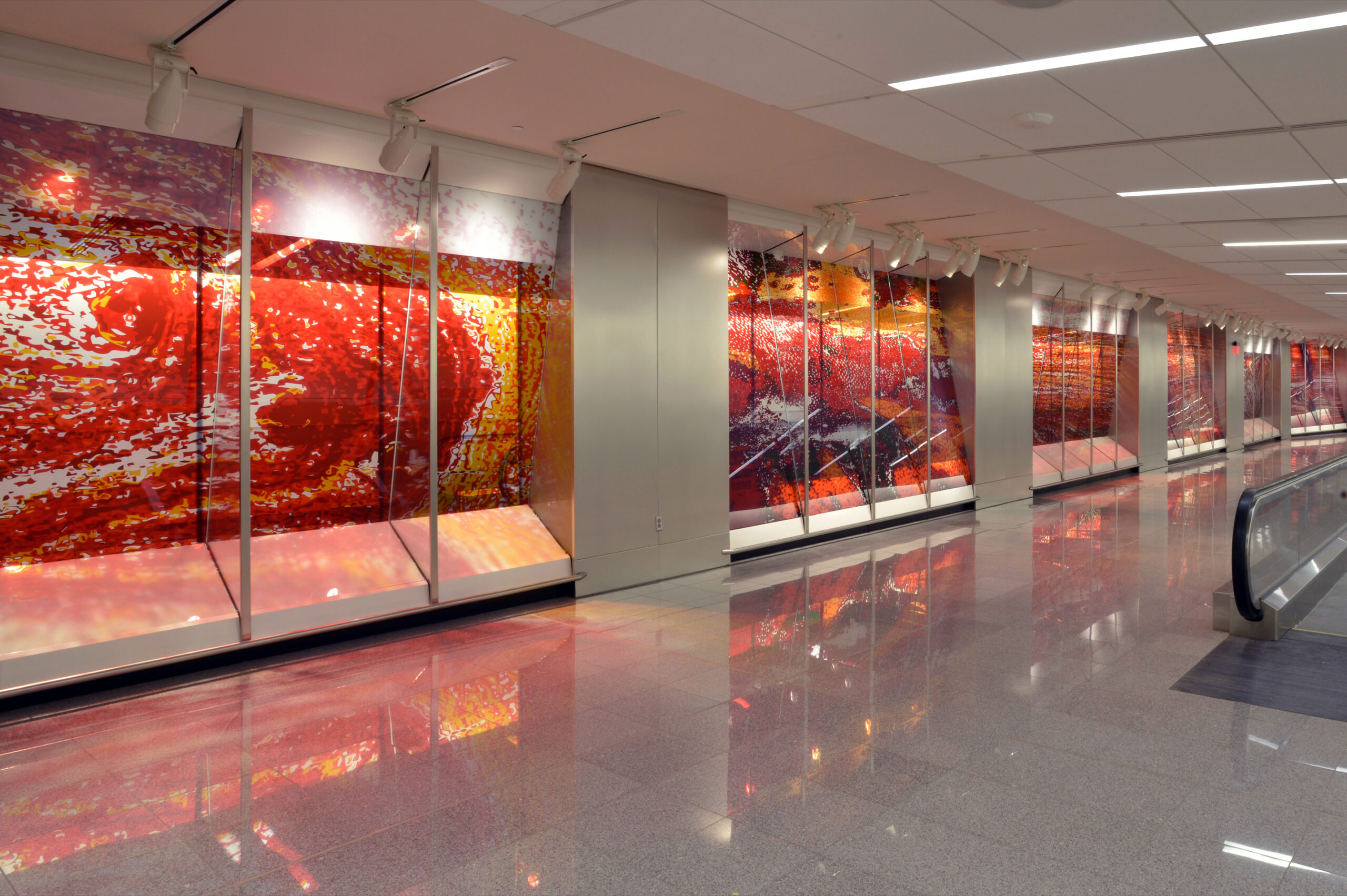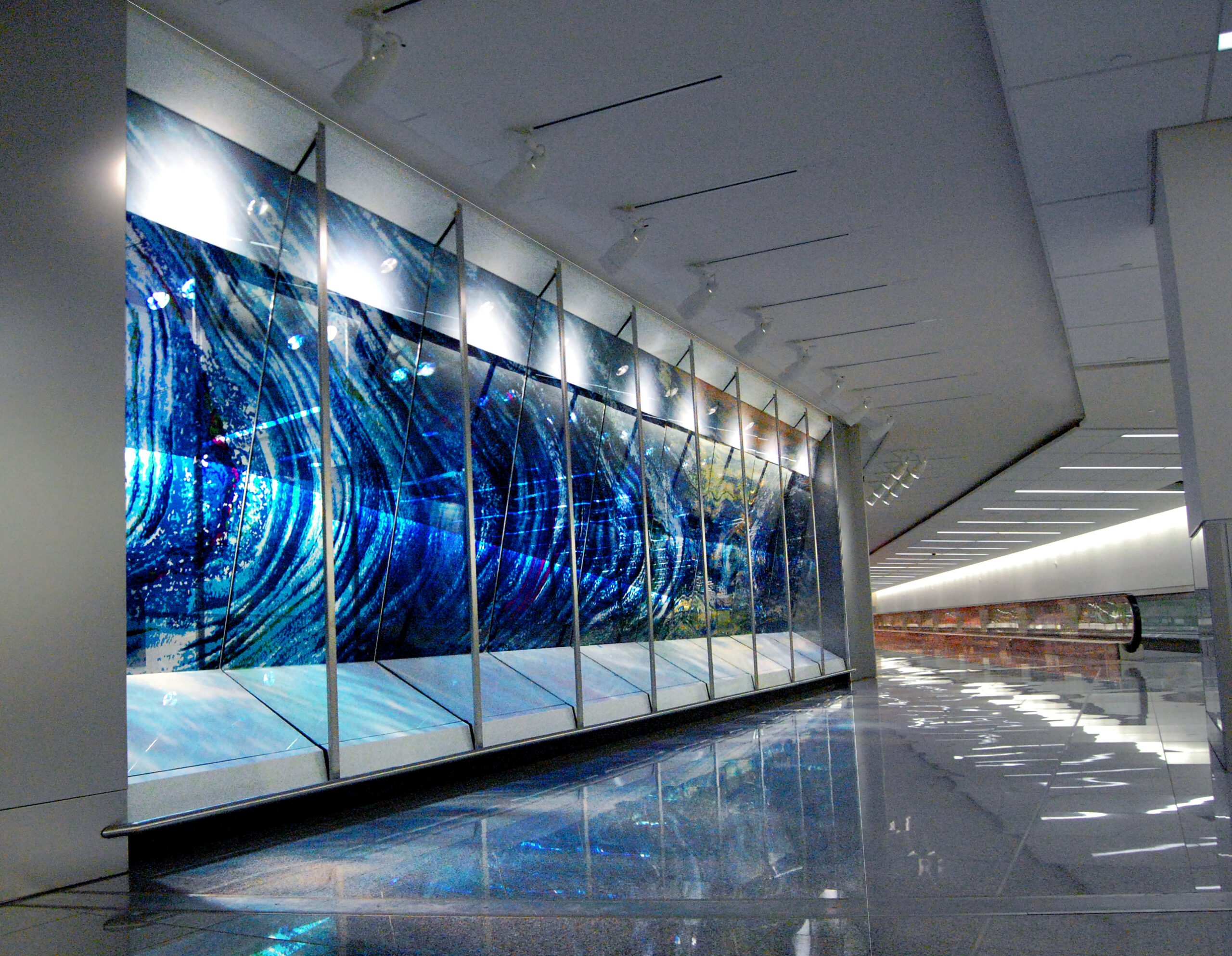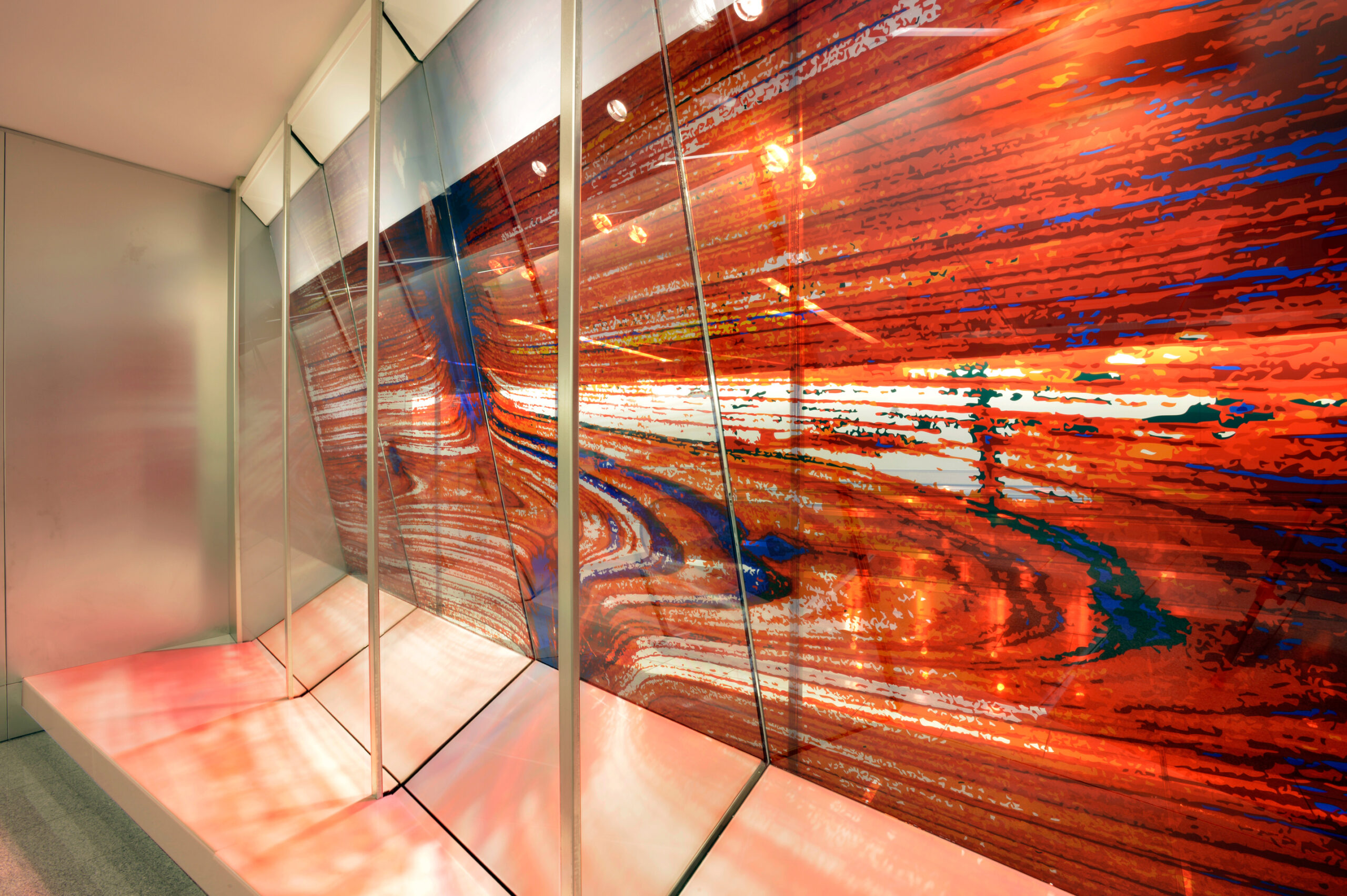 Veneers re-creates a secure glass dividing wall as a glass color field running intermittently between stainless steel clad columns. Veneers explores alterations of nature as images of endangered woods are resuscitated as scans of pure color and image. Digitally enlarged and colorized wood grains are the source of imagery providing an alternate experience of otherwise widely recognizable natural forms. The particular 29 international species represented are identified by both the IUCN, the International Union for the Conservation of Nature and Natural Resources and CITES, the Convention on International Trade in Endangered Species of Wild Flaura and Fauna, as endangered. Veneers, in its way, preserves them.